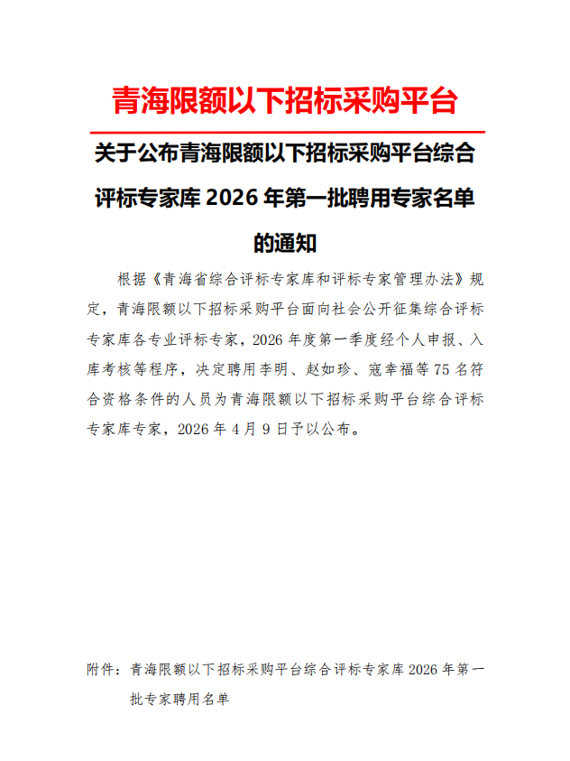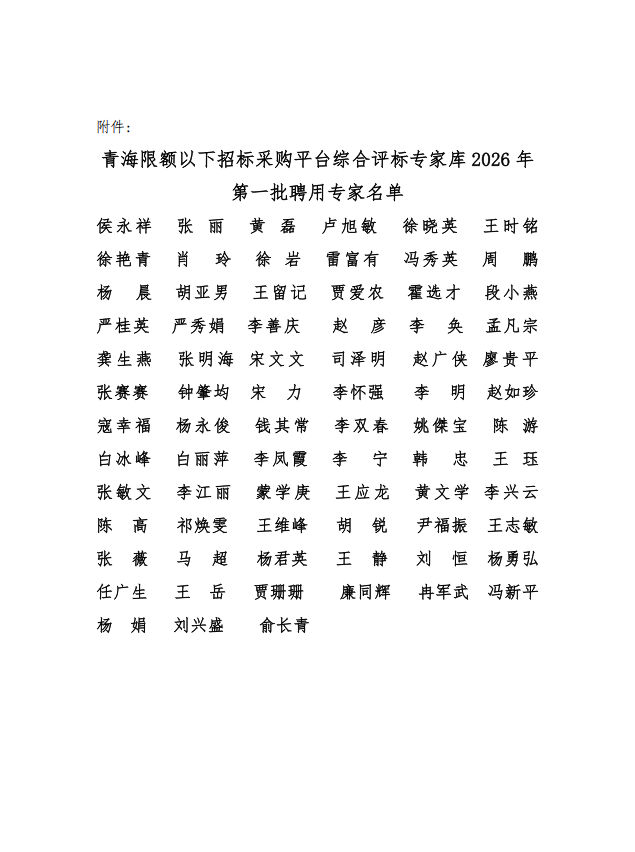 关于公布青海限额以下招标采购平台综合评标专家库2026年第一批聘用专家名单